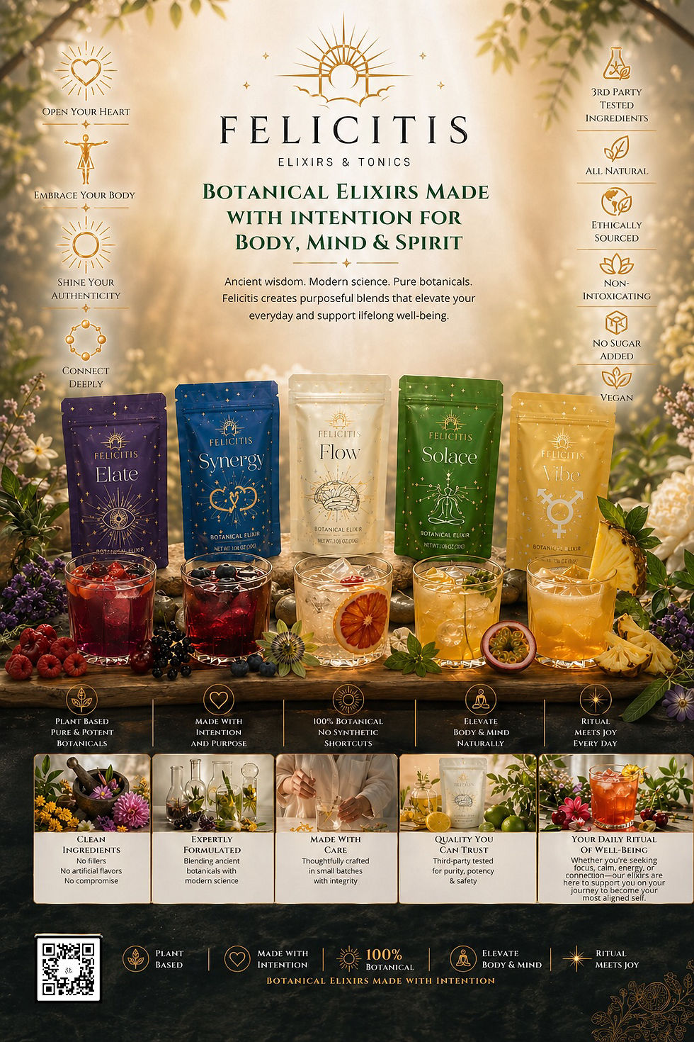 Felicitis Elixirs combines nature's most powerful botanicals into innovative, intentionally formulated blends that are carefully crafted to bring out the best in each ingredient—so you can unlock your best self.